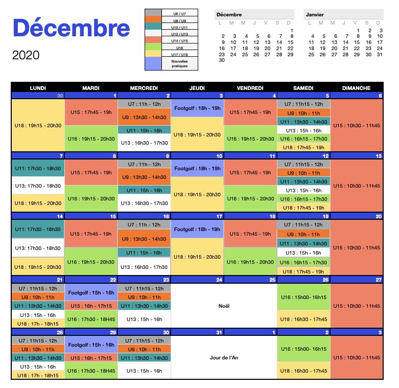 – Des séances supplémentaires ont été ajoutées pour pallier aux matchs qui n’auront pas lieu le week-end : en image de ce message, le calendrier mis en place pour chaque catégorie.