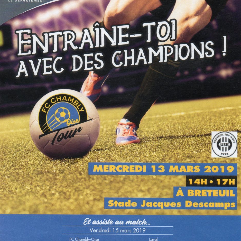 DétailsMERCREDI 13 MARS A BRETEUIL STADE JACQUES DESCAMPS. Séance d’entrainements U10 U11 avec les éducateurs et des joueurs de l’équipe de CHAMBLY. Rappelons que le FC Chambly joue en NATIONAL et vise la montée en LIGUE 2. Un grand merci à eux pour l’intérêt qu’ils portent aux jeunes pousses du football de l’Oise. De beaux…