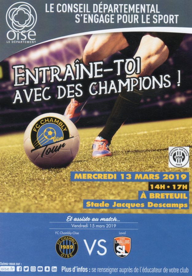 DétailsMERCREDI 13 MARS A BRETEUIL STADE JACQUES DESCAMPS. Séance d’entrainements U10 U11 avec les éducateurs et des joueurs de l’équipe de CHAMBLY. Rappelons que le FC Chambly joue en NATIONAL et vise la montée en LIGUE 2. Un grand merci à eux pour l’intérêt qu’ils portent aux jeunes pousses du football de l’Oise. De beaux…